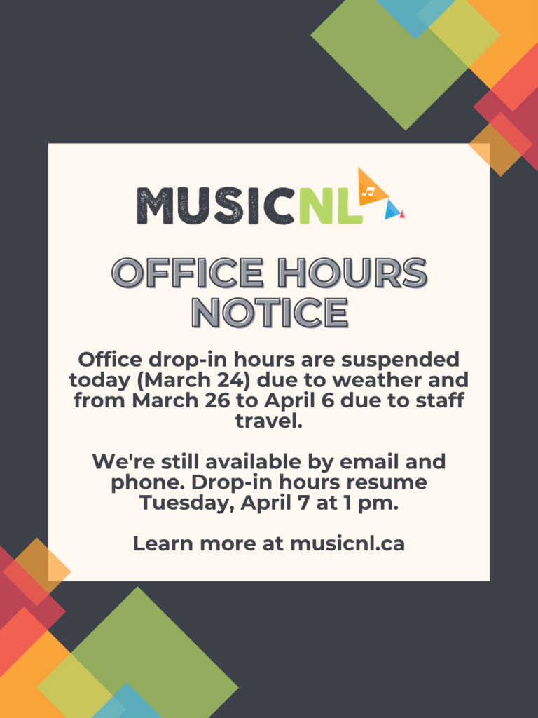 MusicNL drop-in hours are paused this week while our team attends the Hospitality NL Conference.
