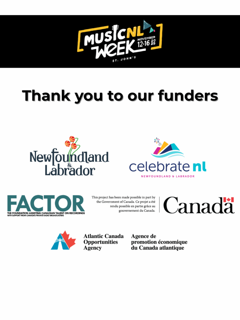 To our sponsors, partners, and funders, thank you for believing in this event and helping us create opportunities for Newfoundland and Labrador’s music community. To the technical and production teams, your expertise and dedication kept every stage, session, performance, and the Export Program running smoothly.