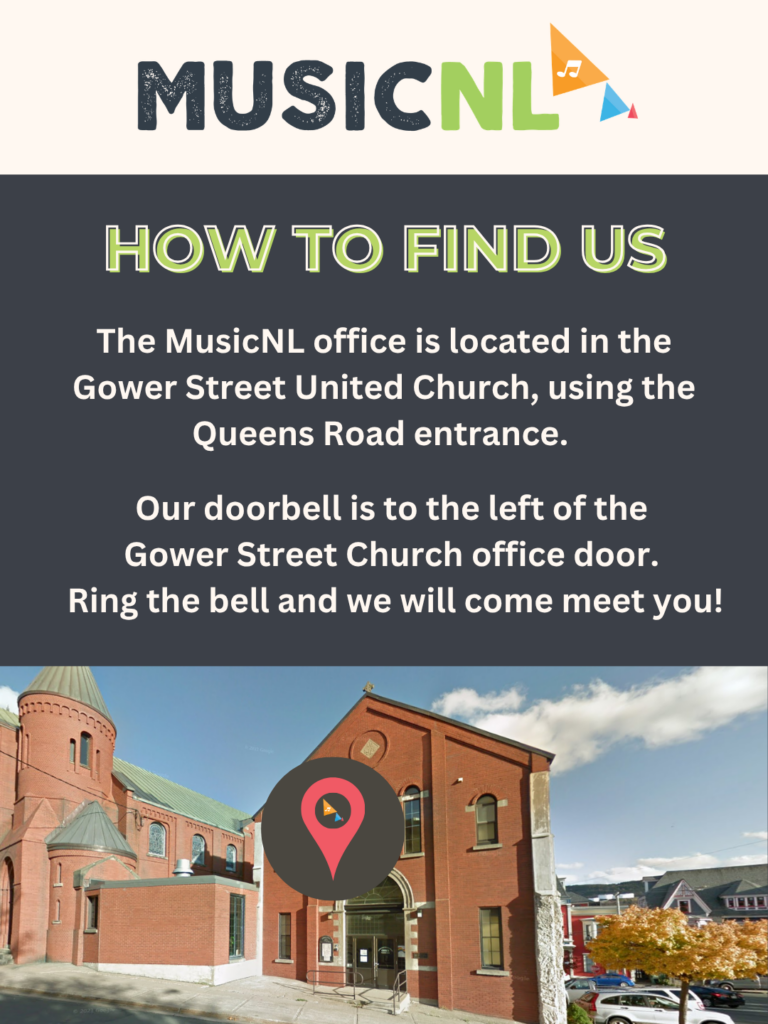 The MusicNL office is located in the Gower Street United Church, using the Queens Road entrance.