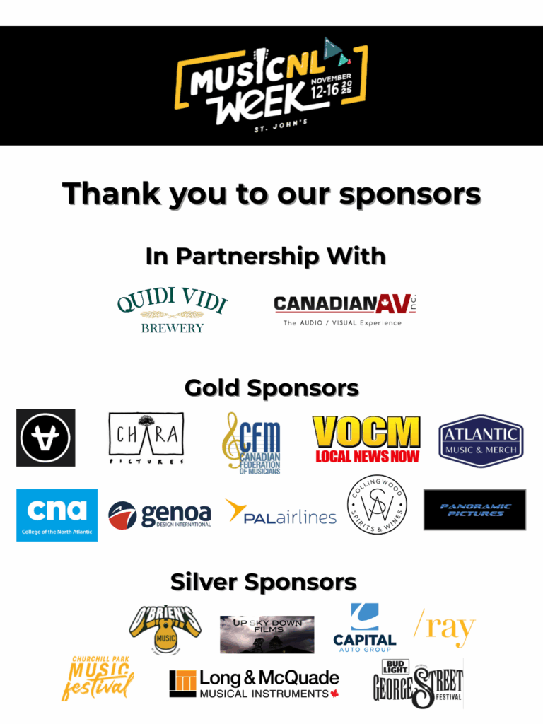 To our sponsors, partners, and funders, thank you for believing in this event and helping us create opportunities for Newfoundland and Labrador’s music community. To the technical and production teams, your expertise and dedication kept every stage, session, performance, and the Export Program running smoothly.